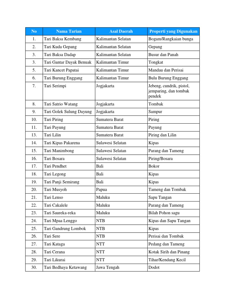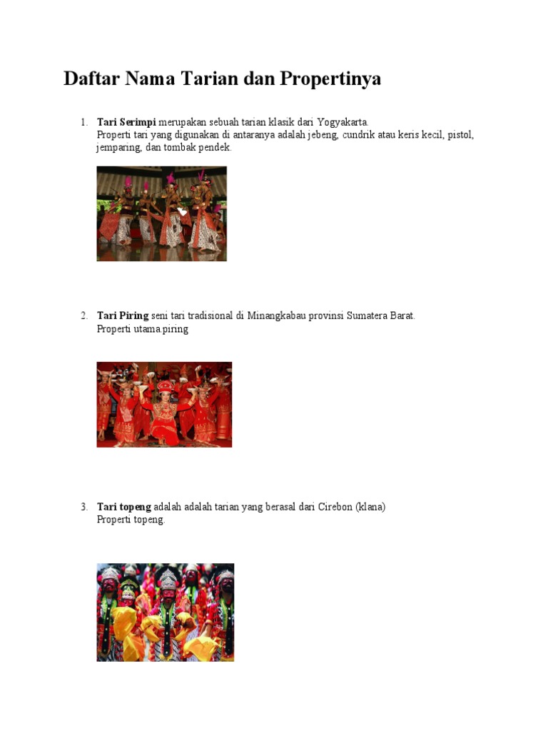 Tari payung bukan hanya atraktif namun juga menunjukkan ekspresi kasih sayang dalam sebuah tarian pergaulan. Tarian Daerah Beserta Propertinya. Untuk memberikan kejelasan terhadap materi tersebut di bawah ini secara terperinci kami sampaikan daftar tari tradisional yang ada di Indonesia yang sangat beragam.