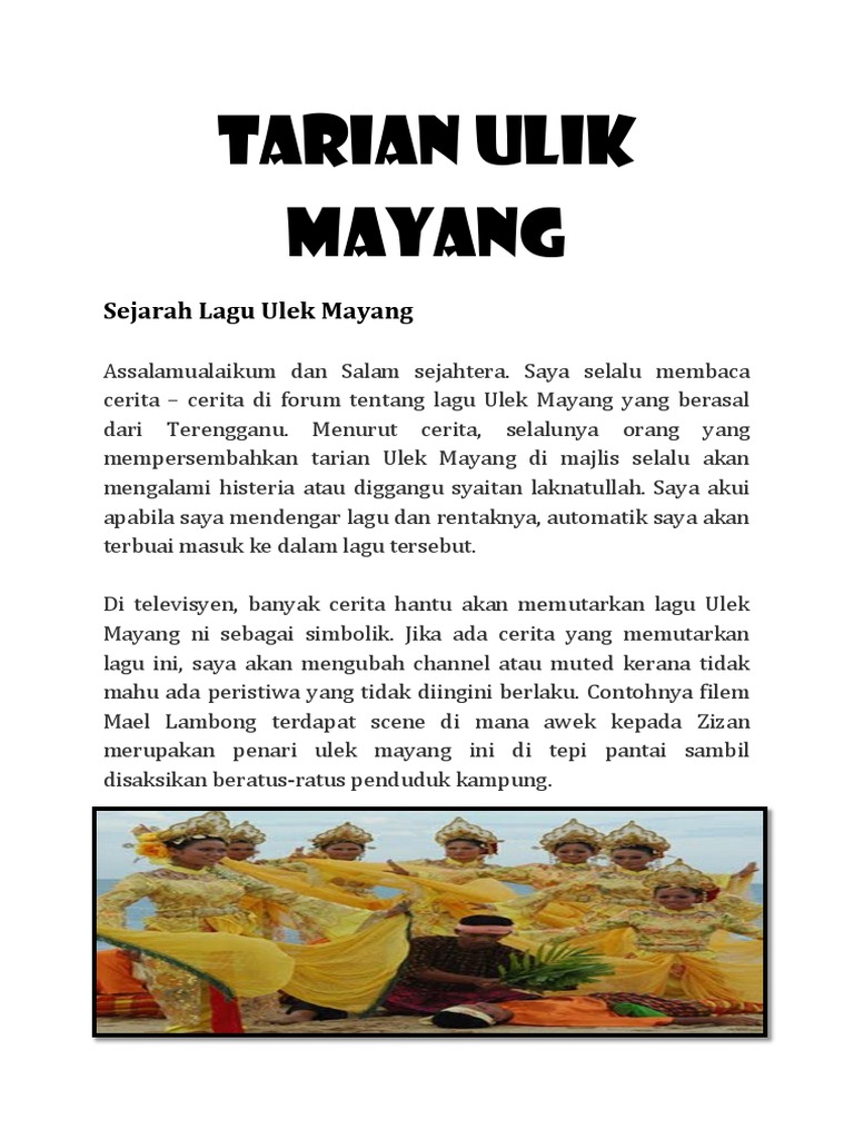 Salah satu tarian tu buat tarian Ulek Mayang ni. Ulek Mayang berasal dari Terengganu satu tarian yang terkenal kerana kaitannya dengan alam mistik. Aspek-aspek pemujaan ada dalam tarian Ulik Mayang.