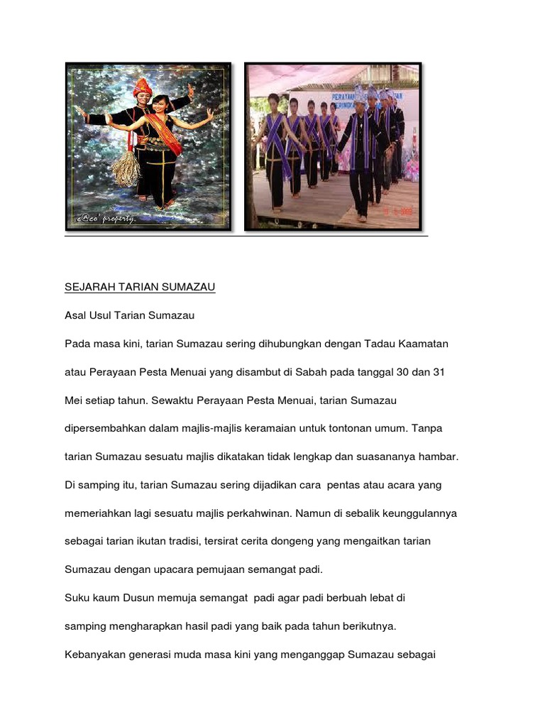 Ia merupakan tarian tradisi suku kaum Kadazandusun yang sering dipersembahkan pada Tadau Kaamatan yang bermaksud Hari Penuaian yang dirayakan di negeri Sabah pada setiap bulan Mei. Tarian Sumazau merupakan sejenis tarian tradisi suku kaum Kadazandusun. Tarian Sumazau merupakan sejenis tarian tradisi rakyat Sabah yang amat terkenal di Sabah dan di seluruh Malaysia.